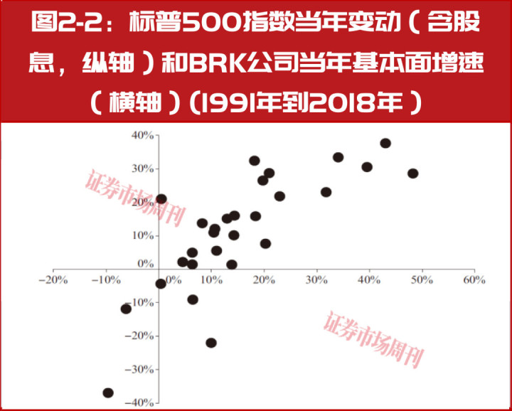 由于BRK公司后来规模变得过大,因此前期和后期的基本面增速变得有所不同,为了比较的准确性,我们可以简单地把1965年到2018年拆成两段:1965年到1990年;1991年到2018年。从图2-1~图2-2中可以看到,在这两段时间里,标普500指数的表现都和BRK公司的基本面增速呈高度正相关关系。