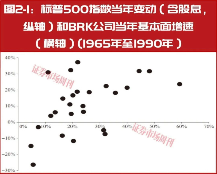 根据伯克希尔-哈撒韦(BRK)公司的年报,巴菲特为投资者整理了BRK公司从1965年到2018年每年的基本面增速(2018年以后巴菲特不再披露),以及当年标普500指数(包含股息率,下同)的回报:这两组数据显示了高度的相关性。也就是说,如果今年标普500指数表现更好,更像一个牛市,BRK公司的基本面增速就会更快。(注意这里指的是基本面增速,而不是股价增速。)