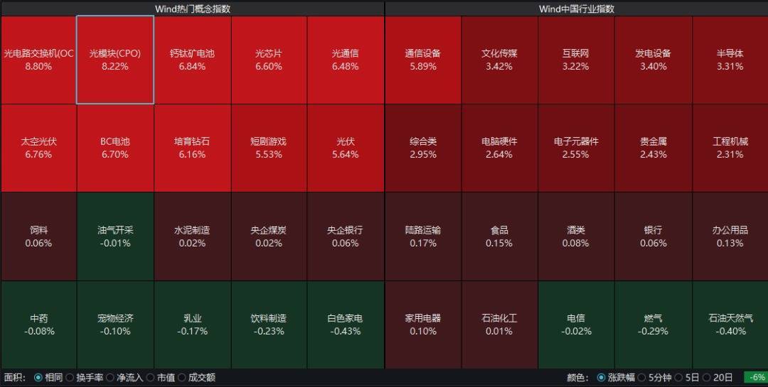 光模块(CPO)指数大涨8.75%,光模块龙头股中际旭创、新易盛、天孚通信盘中集体爆发,不足半日成交额均破百亿元,占据A股前三位置。天孚通信逼近20cm涨停,刷新历史新高。中际旭创盘中涨超5%,新易盛涨超9%。此外,光库科技一度涨停,太辰光涨逾15%,罗博特科、长芯博创等盘中涨逾10%。